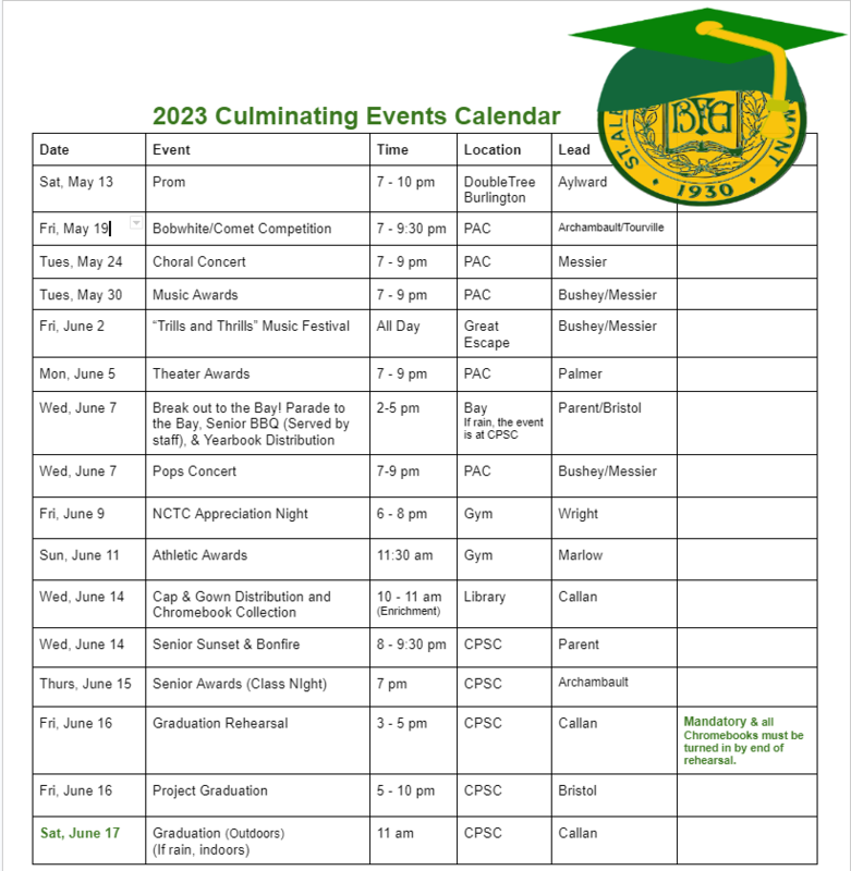 There’s been one change and one addition to the Culminating Events Calendar. The date for the Bobwhite/Comet Contest is now Friday, May 19th, and we’ve added the June 2nd Music Festival information. See the picture below.