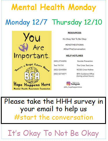 Starting the week of December 7th, you can sign up for meals to take home during Winter Break. Meals will be picked up at BFA North Building next to the cafeteria on December 18th & 22nd from 2:30-3:00. Please contact Teri Brunelle at 527-6404 or by email at tbrunelle@maplerun.org to sign up for the meals. The deadline for signup will be December 14th.